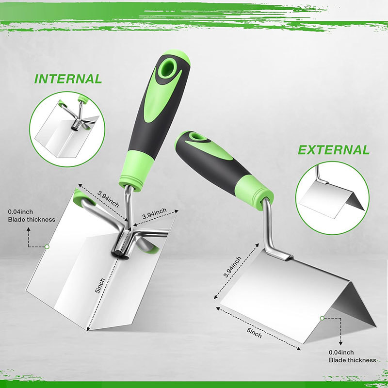 This particular tool set includes two essential trowels: one for external corners and one for internal corners. The external corner trowel measures 5 inches, while the internal corner tool is 3.94 inches, offering versatility for various project sizes and precision requirements.