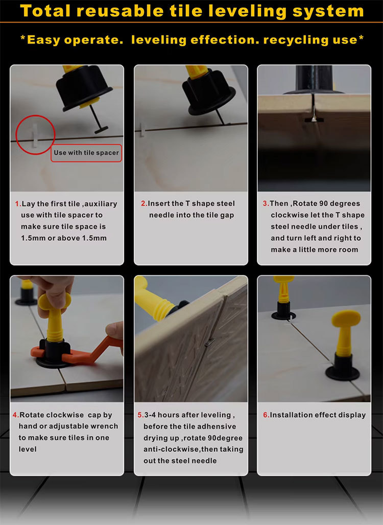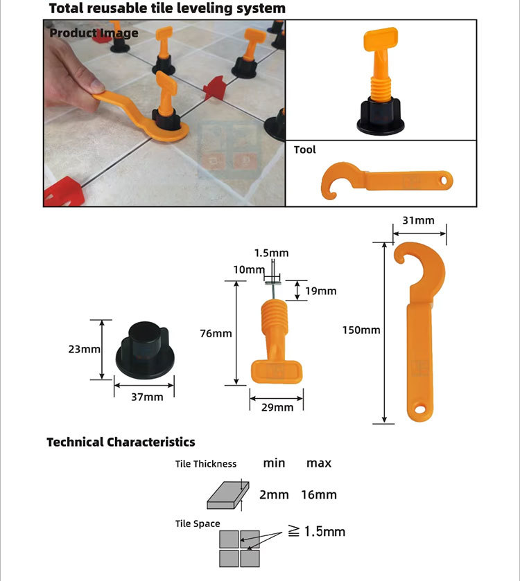 Upgrade your tiling projects with our high-performance Reusable Tile Leveling System, designed to achieve perfectly even surfaces with minimal effort. Crafted from a robust combination of reinforced polypropylene and corrosion-resistant steel components, this tool offers long-lasting performance across diverse settings. Ideal for both residential and commercial applications—such as medical centers, educational institutions, retail spaces, offices, and recreational facilities—it supports comprehensive project planning with options for custom graphic and 3D model design. Each unit is backed by a one-year warranty and carries international certifications for quality and safety, ensuring trust and compliance in global markets.